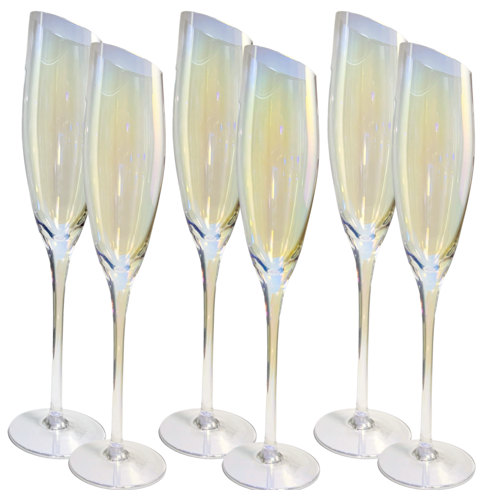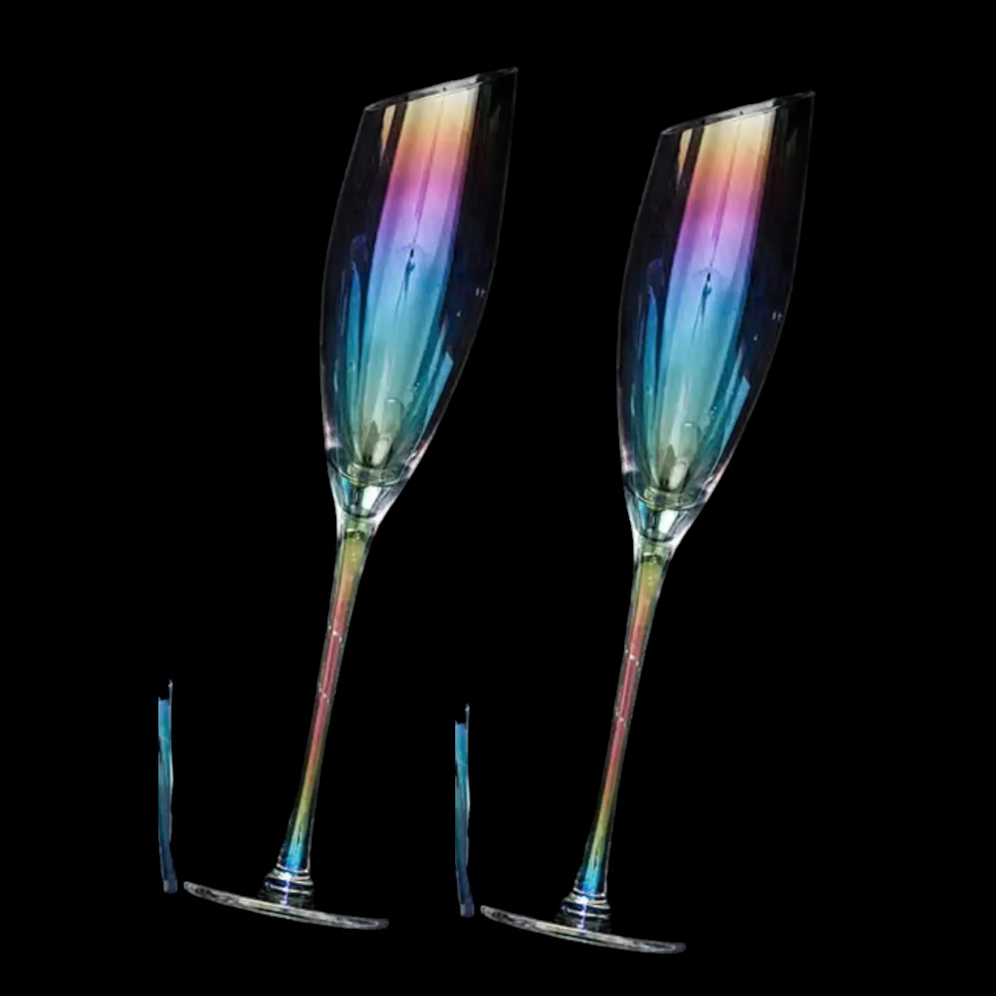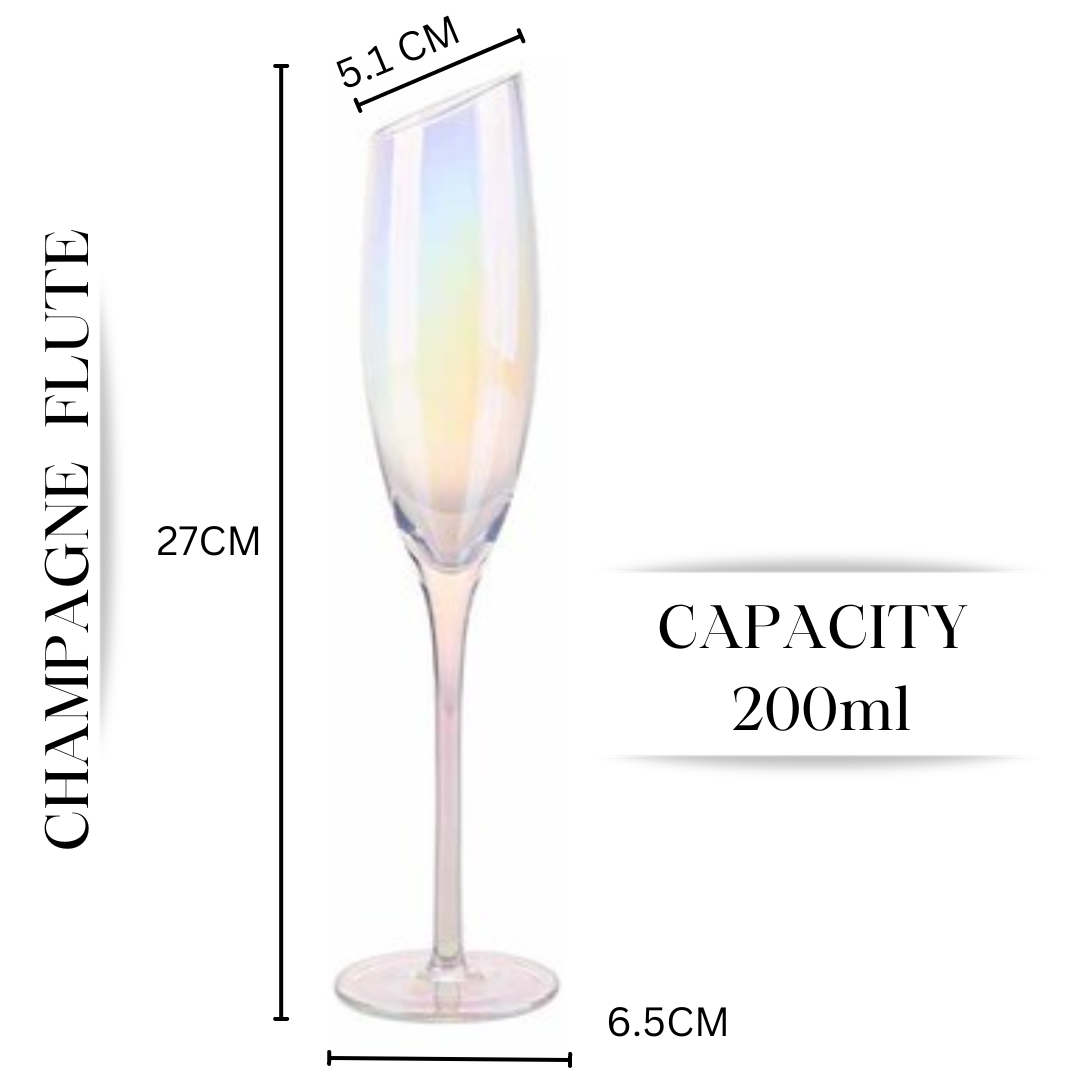 HAND BLOWN - These flutes are made with finest quality, lead-free crystal glass that’s masterfully hand-blown by highly trained artisans to give each champagne glass a gorgeous finish that’s durable and sophisticated.COLORFUL VACUUM ION PLATING PROCESS - Radiant Iridescent Color: These unique glasses feature a brilliant, sparkly Aura effect that makes them perfect for pictures, parties, and memories.DESIGNED TO IMPRESS - Using only high quality crystal glass with a shimmery iridescent coating, these will be the talk of the party.STYLISH CUT RIM DESIGN - One of the most original aspects of these crystal flutes is their slanted rim. It slants at a comfortable angle. When sipping your favorite wine you can inhale the bouquet captured by the shape of these stemware.LASER COLD CUTTING PROCESS - These modern flutes are integrally formed,and the glass mouth uses the latest laser cold cutting technology,so the ultra-thin and smooth rim allows champagne to enter the mouth smoothly,greatly enhancing the perceived quality and flavor of any champagne.SMOOTH TOUCH & COMFORTABLE HOLDING - The curve of the side sits solidly in your hand. It can create the best gripping points for picking up and holding these unique flutes.VERSATILE - These are the ideal way to add a touch of class to any occasion, whether it's a formal reception, a mother’s day, weddings, a father’s day, christmas, birthday, a romantic dinner or a casual get-together with friends.EASY TO CLEAN - Adds a luxury look to your bar top and dining table without the hassle. Carefully crafted these stemmed flutes are dishwasher-safe for quick & easy cleaningPERFECT GIFT IDEA