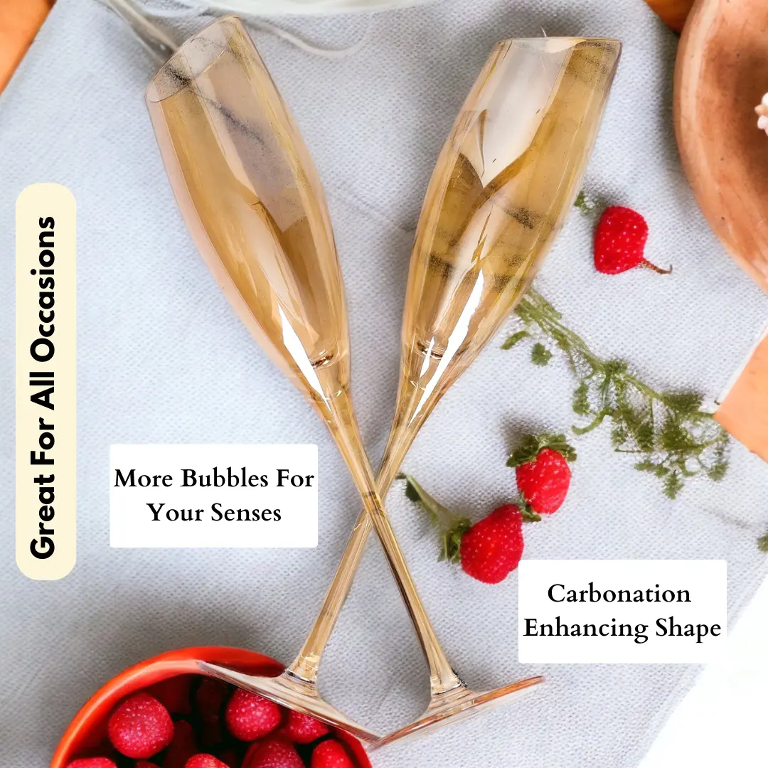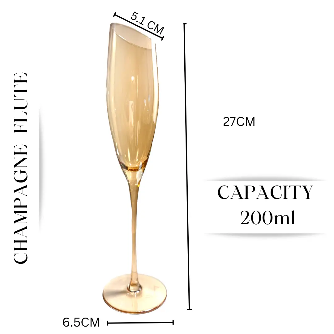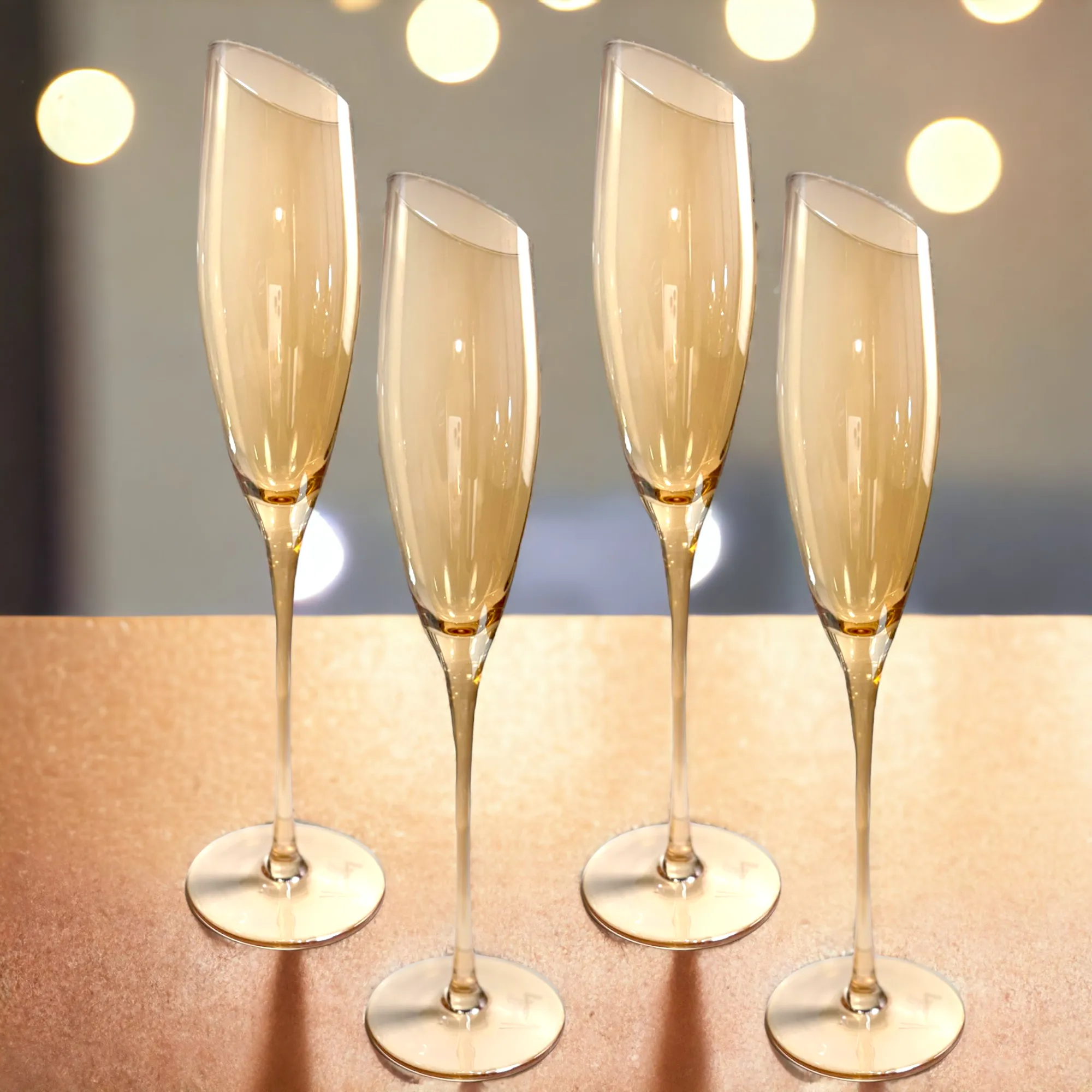HAND BLOWN - These flutes are made with finest quality, lead-free crystal glass that’s masterfully hand-blown by highly trained artisans to give each champagne glass a gorgeous finish that’s durable and sophisticated.COLORFUL VACUUM ION PLATING PROCESS - These unique amber colored champagne flutes adopts a colorful vacuum ion plating process,the color will never fall off, and does not contain any harmful elements,so you can use it with confidence.DESIGNED TO IMPRESS - Using only high quality crystal glass with a shimmery iridescent coating, these will be the talk of the party.STYLISH CUT RIM DESIGN - One of the most original aspects of these crystal flutes is their slanted rim. It slants at a comfortable angle. When sipping your favorite wine you can inhale the bouquet captured by the shape of these stemware.LASER COLD CUTTING PROCESS - These modern flutes are integrally formed,and the glass mouth uses the latest laser cold cutting technology,so the ultra-thin and smooth rim allows champagne to enter the mouth smoothly,greatly enhanced the perceived quality and flavor of any champagne.SMOOTH TOUCH & COMFORTABLE HOLDING - The curve of the side sits solidly in your hand. It can create the best gripping points for picking up and holding these unique flutes.VERSATILE - These are the ideal way to add a touch of class to any occasion, whether it's a formal reception, a mother’s day, weddings, a father’s day, christmas, birthday, a romantic dinner or a casual get-together with friends.EASY TO CLEAN - Adds a luxury look to your bar top and dining table without the hassle. Carefully crafted these stemmed flutes are dishwasher-safe for quick & easy cleaningPERFECT GIFT IDEA
