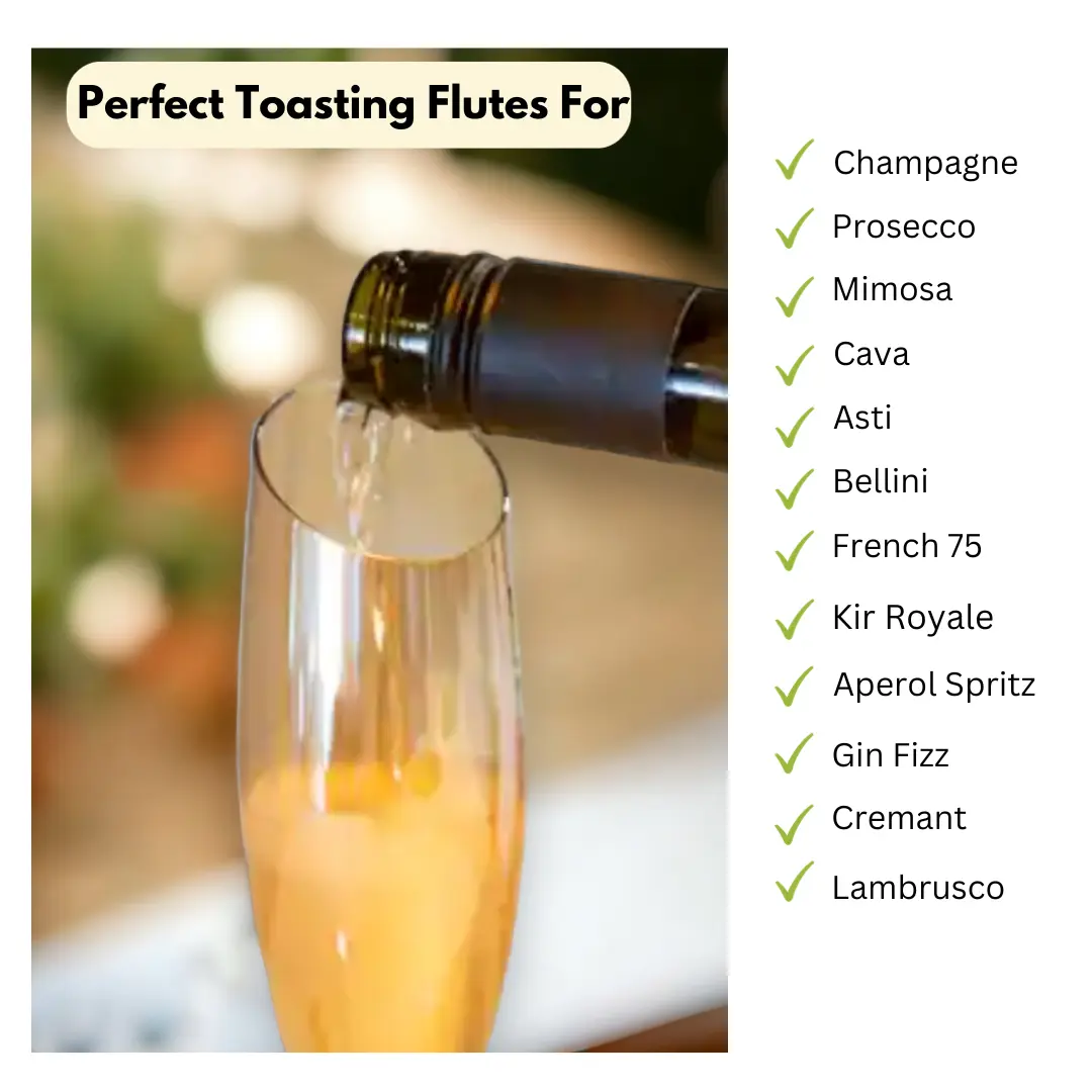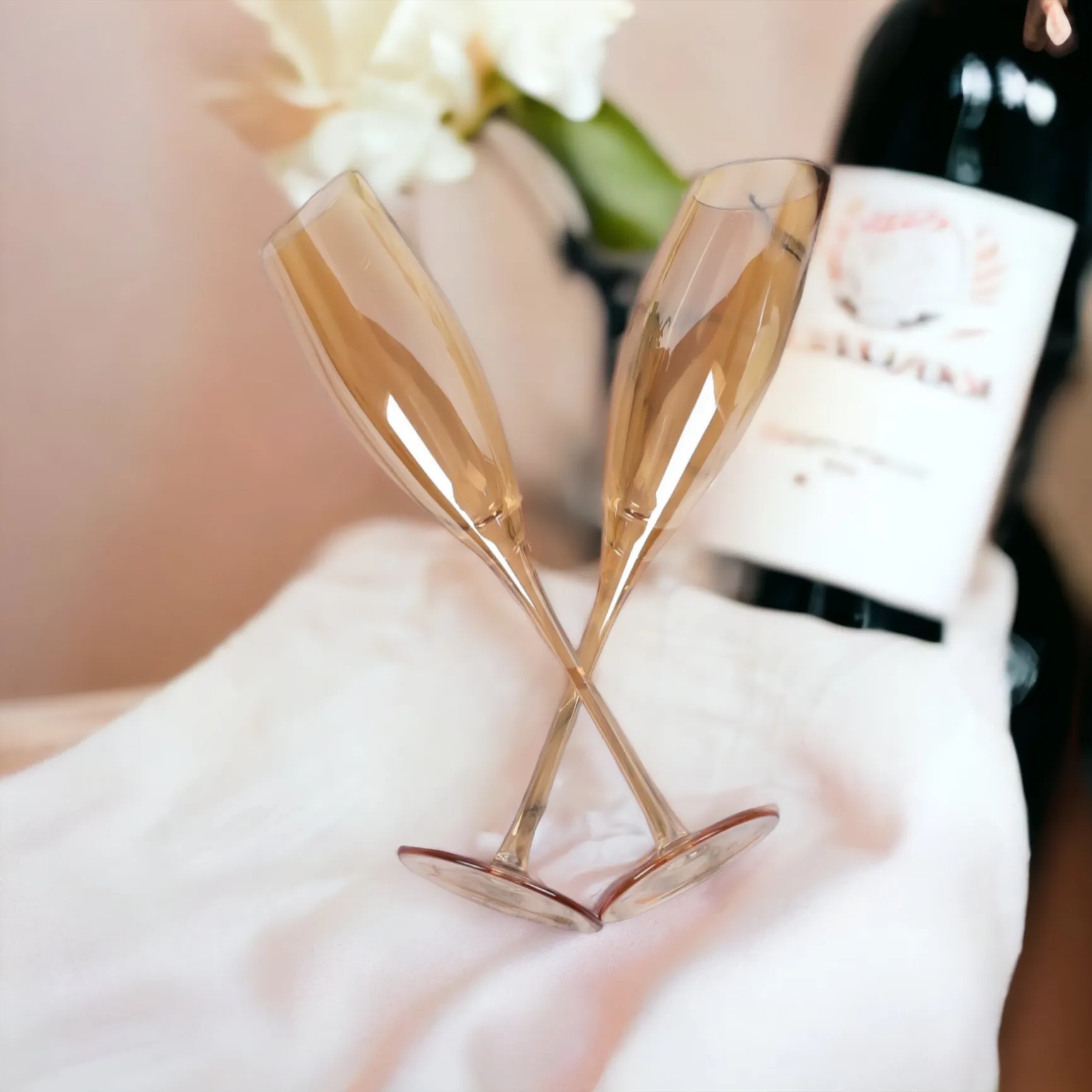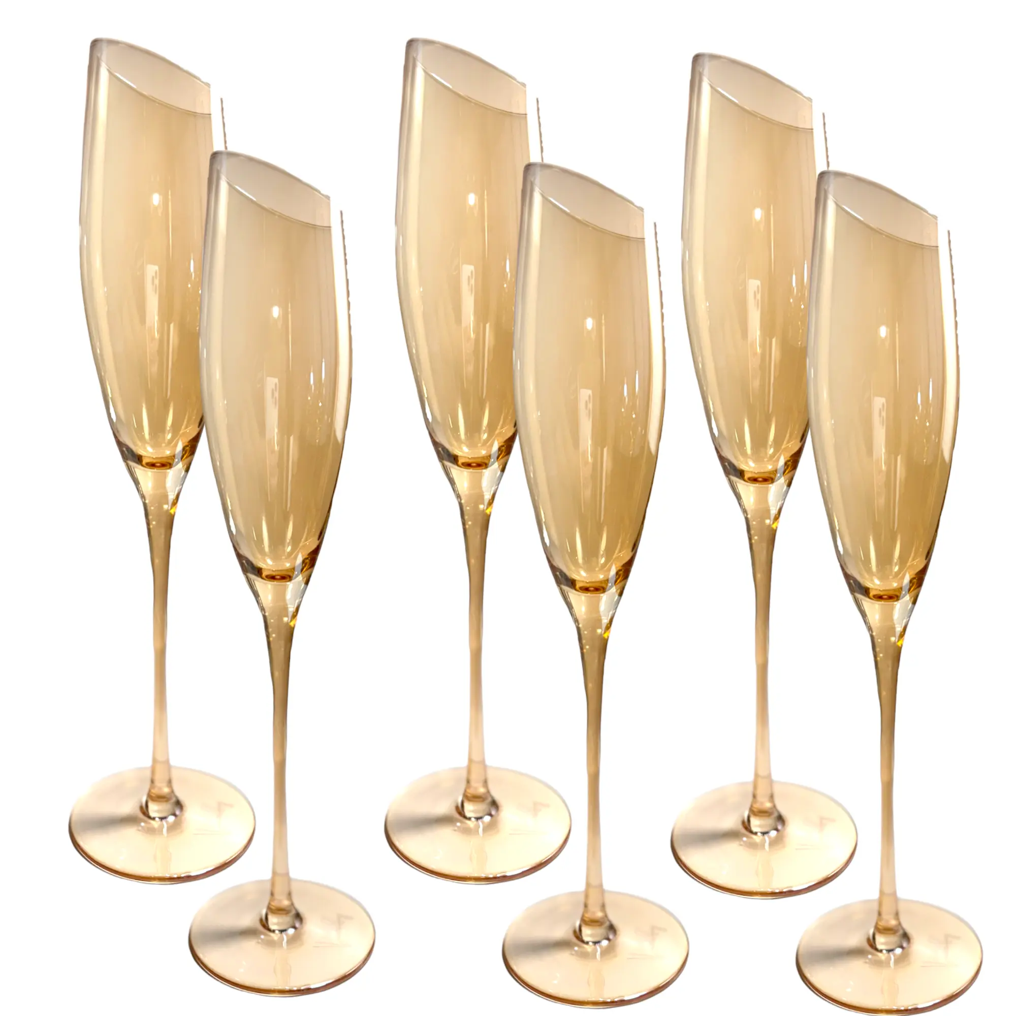 HAND BLOWN - These flutes are made with finest quality, lead-free crystal glass that’s masterfully hand-blown by highly trained artisans to give each champagne glass a gorgeous finish that’s durable and sophisticated.COLORFUL VACUUM ION PLATING PROCESS - These unique amber colored champagne flutes adopts a colorful vacuum ion plating process,the color will never fall off, and does not contain any harmful elements,so you can use it with confidence.DESIGNED TO IMPRESS - Using only high quality crystal glass with a shimmery iridescent coating, these will be the talk of the party.STYLISH CUT RIM DESIGN - One of the most original aspects of these crystal flutes is their slanted rim. It slants at a comfortable angle. When sipping your favorite wine you can inhale the bouquet captured by the shape of these stemware.LASER COLD CUTTING PROCESS - These modern flutes are integrally formed,and the glass mouth uses the latest laser cold cutting technology,so the ultra-thin and smooth rim allows champagne to enter the mouth smoothly,greatly enhanced the perceived quality and flavor of any champagne.SMOOTH TOUCH & COMFORTABLE HOLDING - The curve of the side sits solidly in your hand. It can create the best gripping points for picking up and holding these unique flutes.VERSATILE - These are the ideal way to add a touch of class to any occasion, whether it's a formal reception, a mother’s day, weddings, a father’s day, christmas, birthday, a romantic dinner or a casual get-together with friends.EASY TO CLEAN - Adds a luxury look to your bar top and dining table without the hassle. Carefully crafted these stemmed flutes are dishwasher-safe for quick & easy cleaningPERFECT GIFT IDEA
