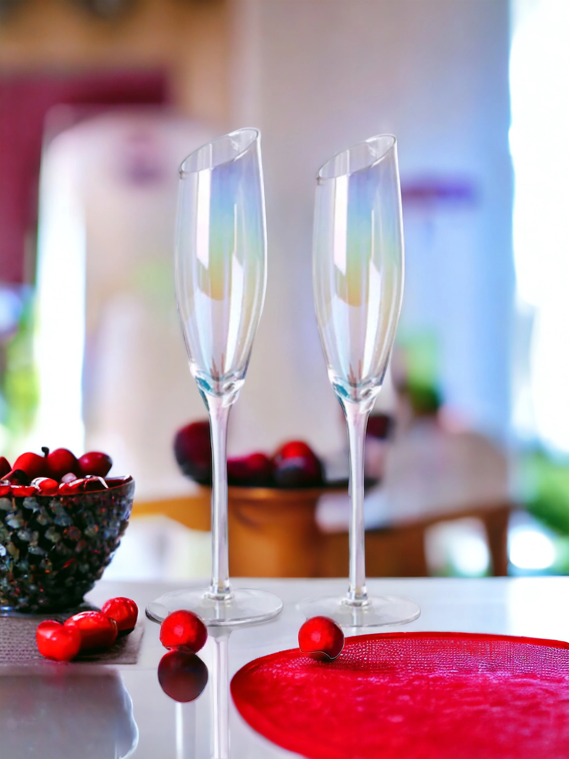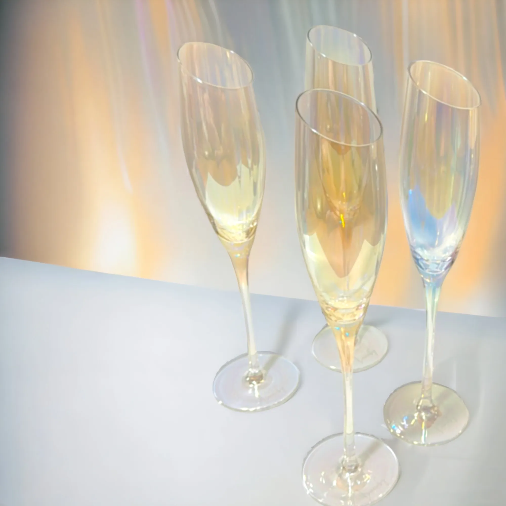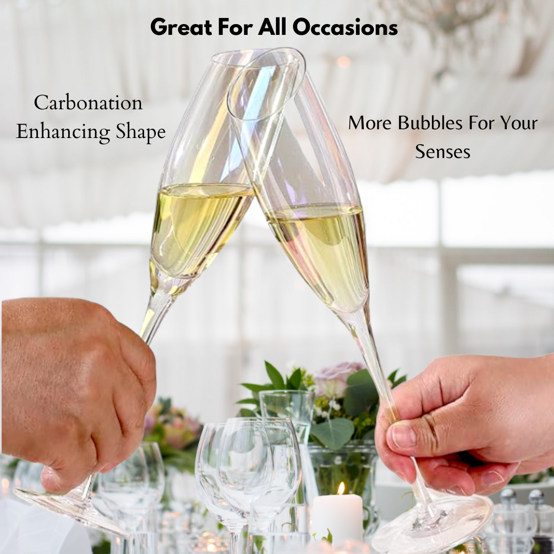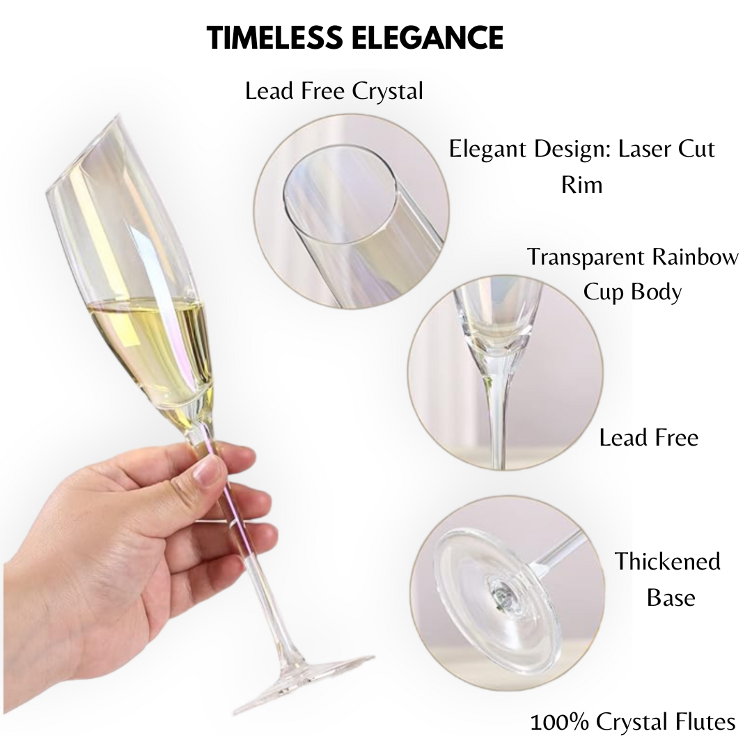 HAND BLOWN - These flutes are made with finest quality, lead-free crystal glass that’s masterfully hand-blown by highly trained artisans to give each champagne glass a gorgeous finish that’s durable and sophisticated.COLORFUL VACUUM ION PLATING PROCESS - Radiant Iridescent Color: These unique glasses feature a brilliant, sparkly Aura effect that makes them perfect for pictures, parties, and memories.DESIGNED TO IMPRESS - Using only high quality crystal glass with a shimmery iridescent coating, these will be the talk of the party.STYLISH CUT RIM DESIGN - One of the most original aspects of these crystal flutes is their slanted rim. It slants at a comfortable angle. When sipping your favorite wine you can inhale the bouquet captured by the shape of these stemware.LASER COLD CUTTING PROCESS - These modern flutes are integrally formed,and the glass mouth uses the latest laser cold cutting technology,so the ultra-thin and smooth rim allows champagne to enter the mouth smoothly,greatly enhancing the perceived quality and flavor of any champagne.SMOOTH TOUCH & COMFORTABLE HOLDING - The curve of the side sits solidly in your hand. It can create the best gripping points for picking up and holding these unique flutes.VERSATILE - These are the ideal way to add a touch of class to any occasion, whether it's a formal reception, a mother’s day, weddings, a father’s day, christmas, birthday, a romantic dinner or a casual get-together with friends.EASY TO CLEAN - Adds a luxury look to your bar top and dining table without the hassle. Carefully crafted these stemmed flutes are dishwasher-safe for quick & easy cleaningPERFECT GIFT IDEA